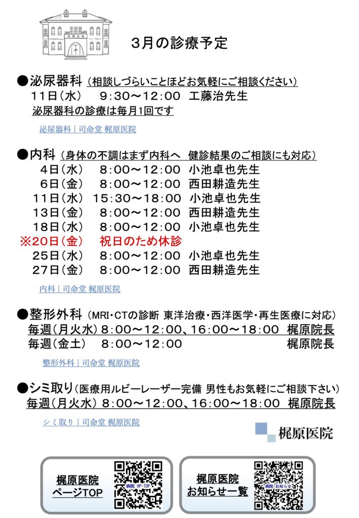 診療の日時は変更になる場合があります。梶原医院のお知らせページをご参照ください。また、お電話(042-685-0611)での確認をおすすめします。